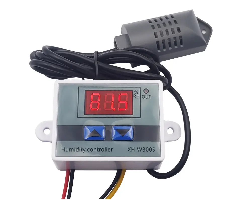 Для регулирования влажности. Программируемый влагорегулятор XH-W3005 предназначен для контроля влажности в диапазоне от 0 до 99%, имеет LED дисплей с тремя знаками, светодиодный индикатор включения реле, две кнопки управления «» и «», четыре провода — красный и черный для подключения питания прибора, желтый и черный для подключения нагрузки, внешний датчик SHT20, длина кабеля 90 см.